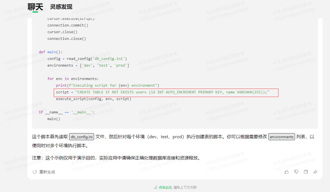 2、一般我们执行db文件的话,文件中不可能只有一条sql语句 ,一般肯呢个存在多条,这个用脚本去执行的时候,ai生成的脚本一般都是直接一起执行,这个在执行的时候其实是会报错的,当你把错误信息发给ai之后,他只会让你去检查是否有语法错误啥的,并不会帮你去把sql脚本进行拆分执行。但是换一个方式去向他提问的时候,他会帮你把文件拆分为单条语句去执行: