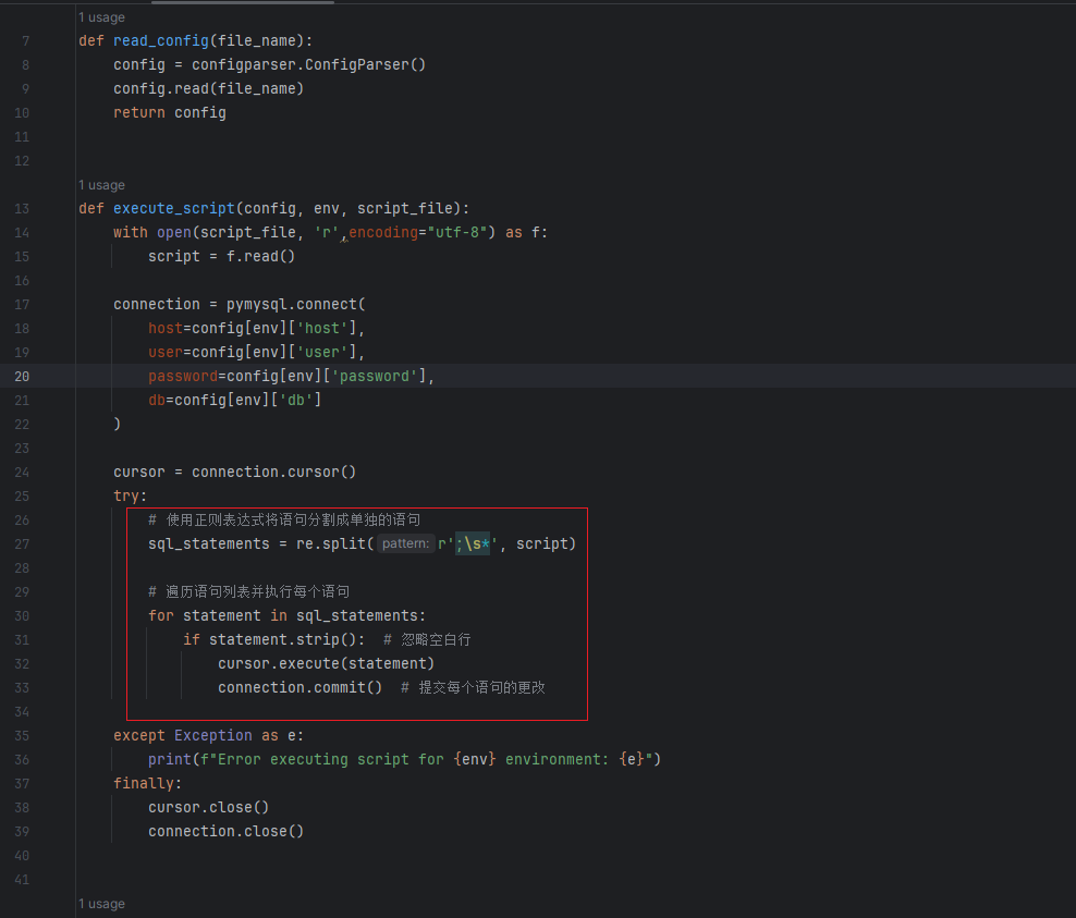 prompt1:我需要保持多态测试环境的mysql表结构一致,以及批量执行建表和加字段的脚本等,请问用python怎么实现。要求可以同时对多个环境执行脚本,并且数据库的信息和db文件要分别写在配置文件中,数据库配置文件中要支持给每个配置设置环境名称