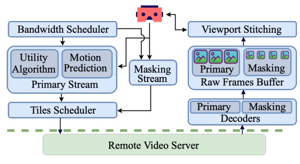为了确保无缝连续播放,Dragonfly 使用两个流:(i) 主要流,它以高质量对视口内 tile 进行编码;以及(ii) 较低质量的保障流,以弥补缺失 tile 的效果。
