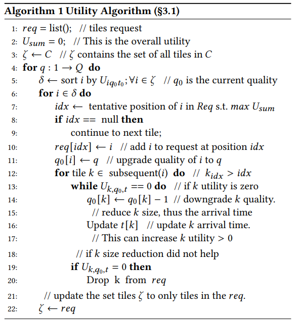 时到达),否则初始化为 0。维护一个列表(初始为空的抓取列表),其中包含主要流应获取的所有 tile 以及相关质量。每一轮中,算法首先计算将每个 tile 从其当前分配的质量提升到质量 𝑞 的效用增益。它按效用增益最大的顺序考虑每个 tile 。对于考虑的每个 tile 𝑖,算法考虑将该 tile 的质量升级到 𝑞 对总效用的影响,并将其插入抓取列表的每个可能位置。这涉及到为每个潜在的列表位置计算 tile 的到达时间,调整抓取列表中后续 tile 的到达时间,并重新计算所有这些 tile 的效用。