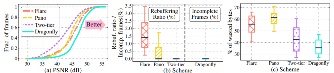 图 8 总结了 Dragonfly 变体的性能。在图 8(a) 中,Dragonfly 按预期流式传输最高的视口质量。Dragonfly 的中位 PSNR 比 PerChunk 和 PassiveSkip 分别高 4.8dB 和 1.6dB。PerChunk 在各变体中的 PSNR 最低,表明细化提取决策的重要性。接下来,PassiveSkip 的 PSNR 明显低于 Dragonfly。这表明仅仅使用背景流是不够的,而 Dragonfly 采用的主动跳过策略来决定提取哪些主要 tile 是至关重要的。NoMask 在中位 PSNR 上与 Dragonfly 相当,然而,在图 8(a)的放大部分中,它显示出一个显著的尾部。这是因为 NoMask 具有一小部分不完整的视口,影响了 PSNR 的尾部。