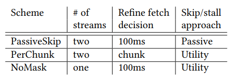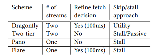 在决定如何在主要流中安排 tile 获取时,现有方法如 Flare 和 Pano 不能直接应用,因为它们旨在获取所有 tile 同时最小化停滞。一个潜在的解决方案是使用这些算法,然后简单地跳过未在截止时间前到达的 tile (一种被动跳过策略),以实现连续播放。
