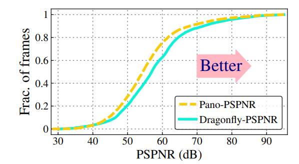 可选的质量度量:PSPNR。尽管 Dragonfly 优化 PSNR,但它也可以使用其他质量度量。我们将优化 PSPNR 的 Dragonfly 和 Pano 的变体与上述相同的视频、用户轨迹和带宽轨迹进行比较。图 7 显示,Dragonfly-PSPNR 的性能优于 Pano-PSPNR。进一步分析显示,Dragonfly 在所有视口上实现了更高的 PSPNR,并在 69% 的视口上将 PSPNR 提高了 2dB 以上。