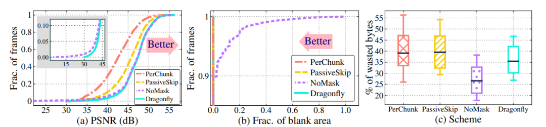 图 8(b) 展示了各种方案下每个视口的空白区域的百分比。NoMask 是唯一具有不完整视口的变体,不完整的视口约占 10%。而即使在视口不完整的情况下,Dragonfly 的主动跳过算法确保了提取视口的关键区域,从而减少了对绝大多数帧的 PSNR 的影响。