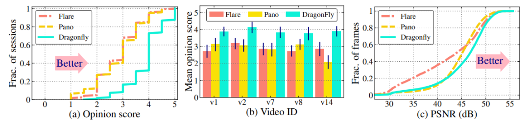 图 6(a) 表示,Dragonfly 在 PSNR 方面表现最佳。相对于Flare和Pano,中位PSNR分别高出1.72 dB和2.5 dB。