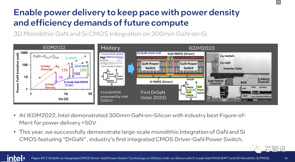 这一次,英特尔展示了一项大规模的3D单片工艺,在同一块300毫米晶圆上将氮化镓和硅CMOS集成在一起,采用了可以称之为“层转移”的工艺。这一被称为“DrGaN”的技术,是业界领先的CMOS驱动器与氮化镓功率器件集成技术。