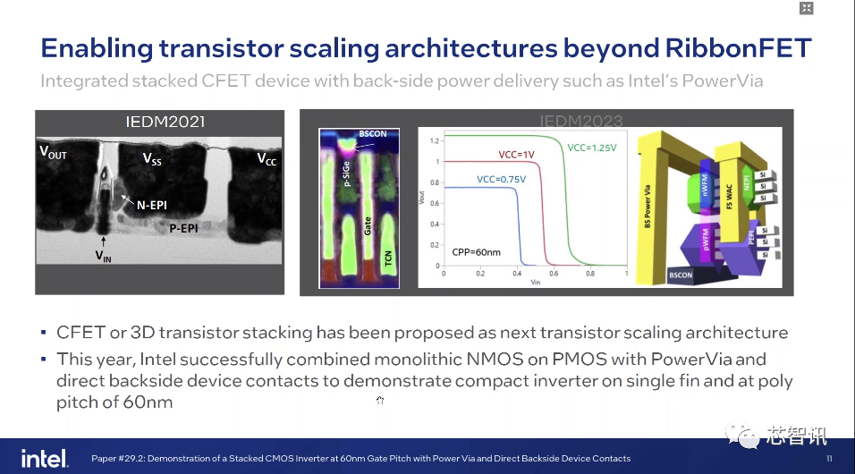 英特尔在本次IEDM 2023上,宣布实现了业界领先的、突破性的3D堆叠CMOS晶体管,并结合了背面供电和背面触点技术: