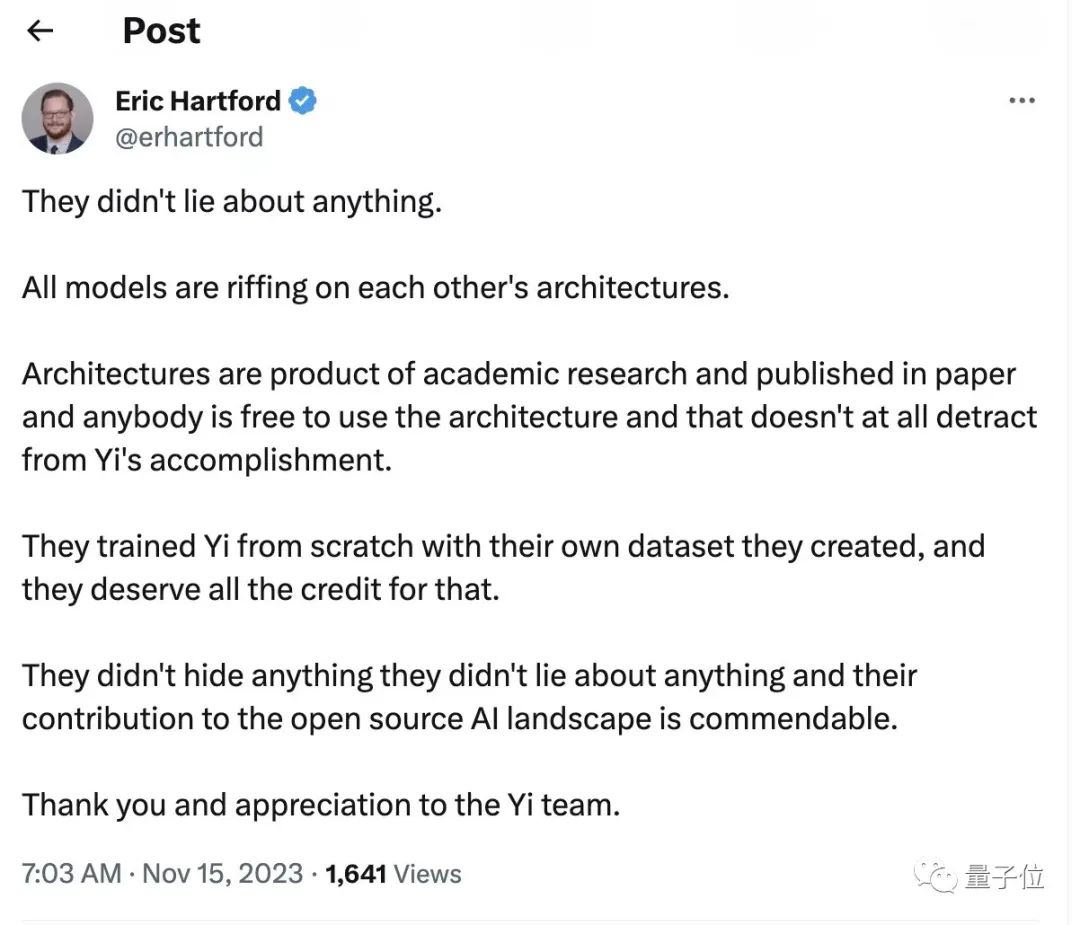 然而Eric自己也没有预想到,他的这个建议,在国内竟被曲解、误读,引发了舆论关于Yi模型“抄袭”LLaMA的质疑。