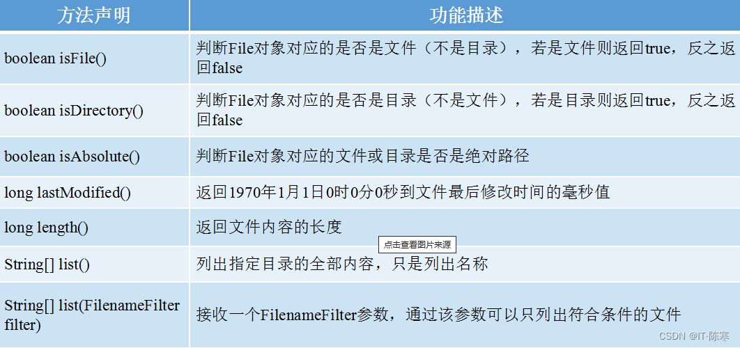 在操作文件和目录时,我们经常需要获取文件的信息、判断文件类型以及创建文件或目录。以下是一些常用的File类方法: