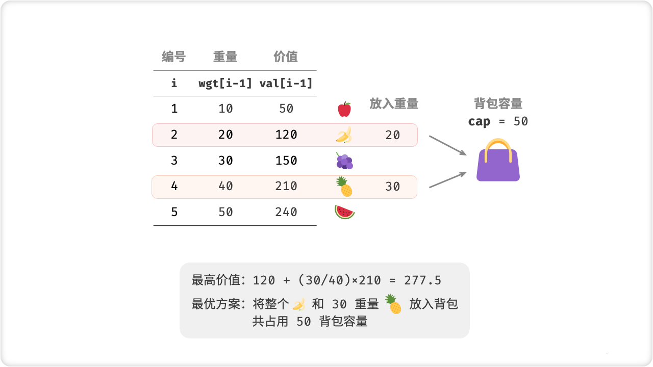 (2)如果当前物品不能完全放入背包,就将能放入的部分放入背包。