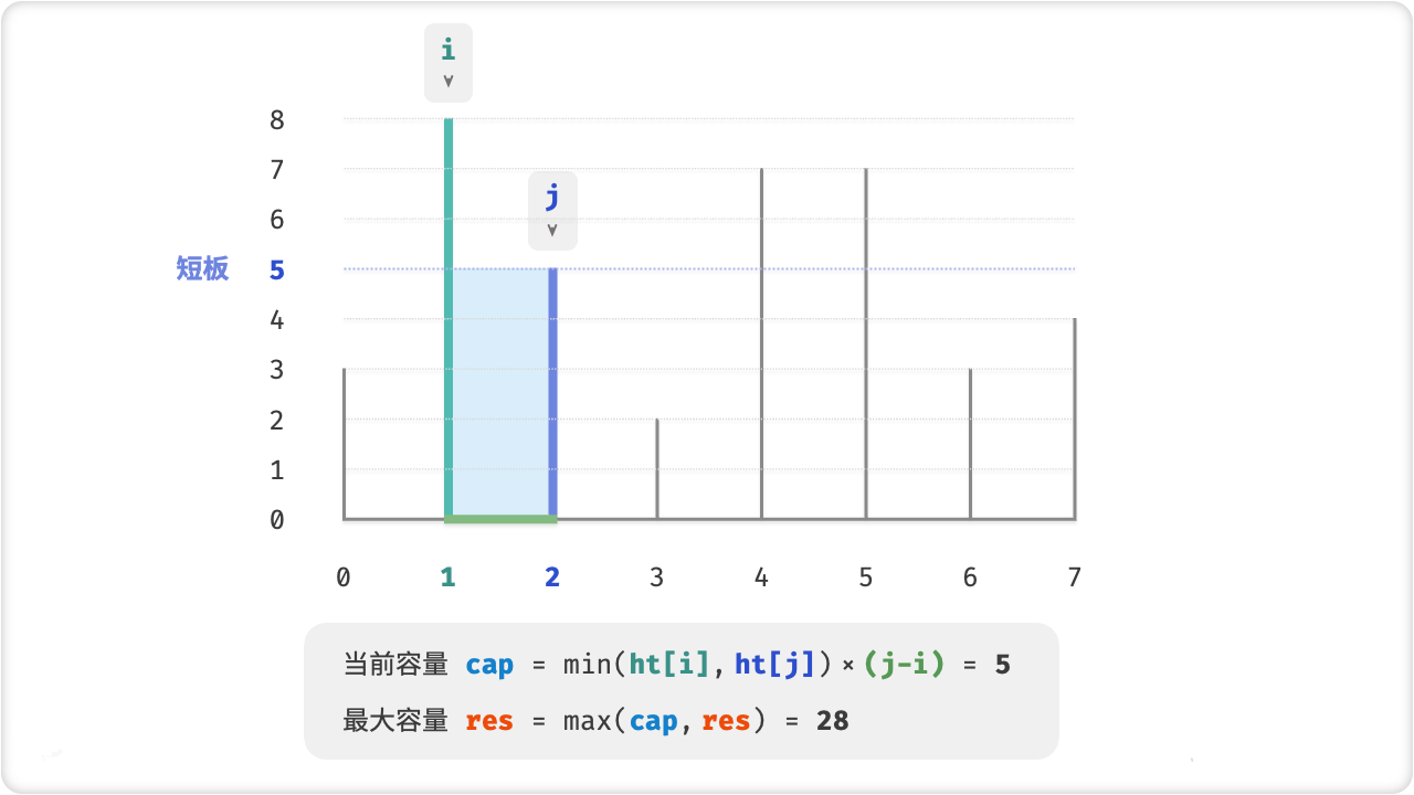 容器的容量等于高度和宽度的乘积(即面积),其中高度由较短的隔板决定,宽度是两个隔板的数组索引之差。