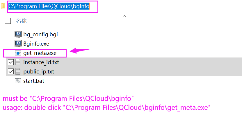 注意,必须是C:\Program Files\QCloud\bginfo\ 、"C:\Program Files\QCloud\bginfo\get_meta.exe"