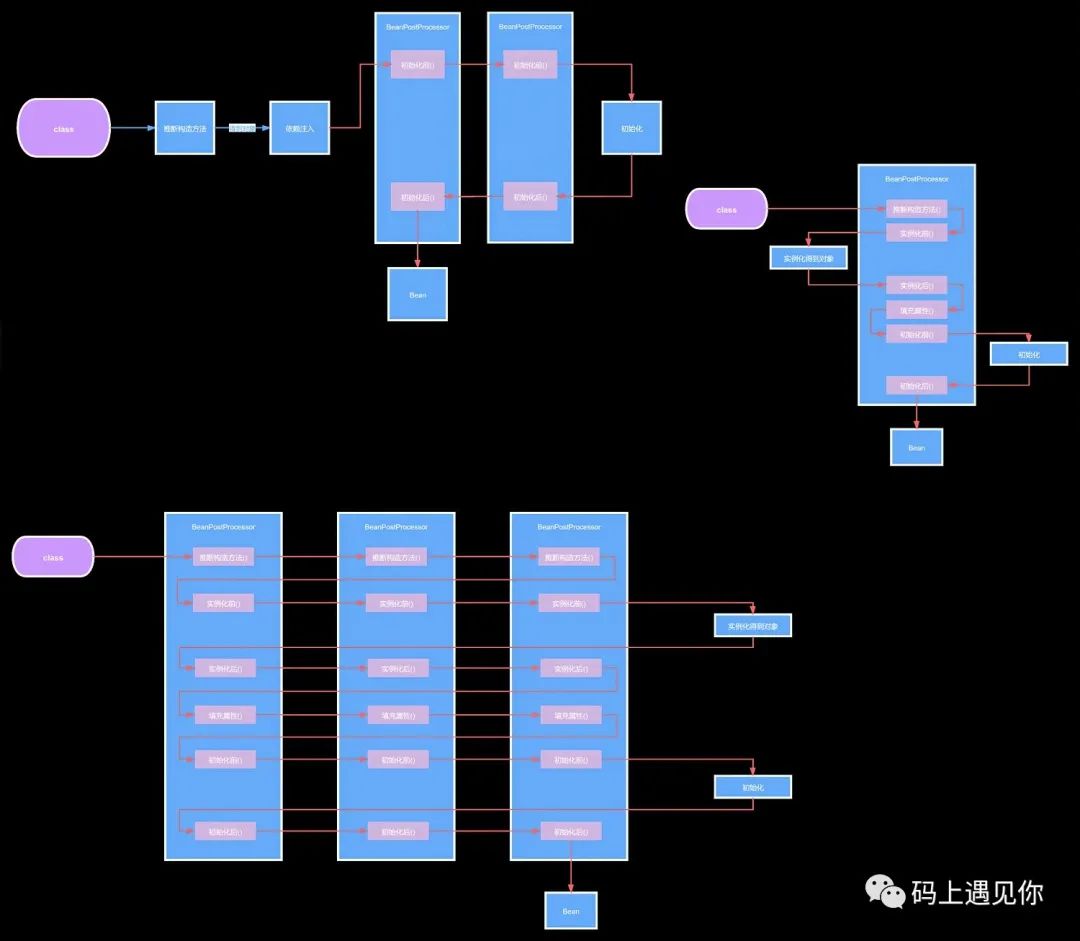 Spring中的后置处理器分为BeanFactory后置处理器和Bean后置处理器,它们是Spring底层源码架构设计中非常重要的一种机制,同时开发者也可以利用这两种后置处理器来进行扩展。BeanFactory后置处理器表示针对BeanFactory的处理器,Spring启动过程中,会先创建出BeanFactory实例,然后利用BeanFactory处理器来加工BeanFactory,比如Spring的扫描就是基于BeanFactory后置处理器来实现的,而Bean后置处理器也类似,Spring在创建一个Bean的过程中,首先会实例化得到一个对象,然后再利用Bean后置处理器来对该实例对象进行加工,比如我们常说的依赖注入就是基于一个Bean后置处理器来实现的,通过该Bean后置处理器来给实例对象中加了@Autowired注解的属性自动赋值,还比如我们常说的AOP,也是利用一个Bean后置处理器来实现的,基于原实例对象,判断是否需要进行AOP,如果需要,那么就基于原实例对象进行动态代理,生成一个代理对象。