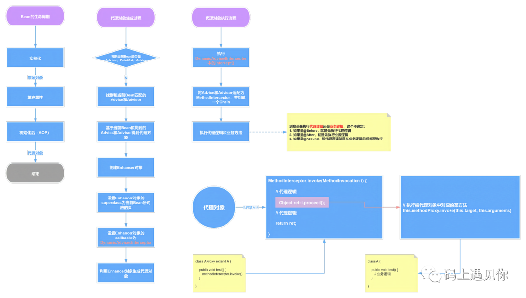 利用动态代理技术来实现AOP,比如JDK动态代理或Cglib动态代理,利用动态代理技术,可以针对某个类生成代理对象,当调用代理对象的某个方法时,可以任意控制该方法的执行,比如可以先打印执行时间,再执行该方法,并且该方法执行完成后,再次打印执行时间。