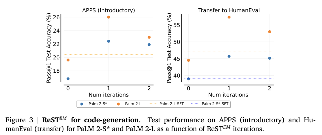 对于MATH数据集,第一次迭代后测试性能的提高幅度很小,而对于APPS,作者实际上观察到第二次迭代时性能出现了倒退。