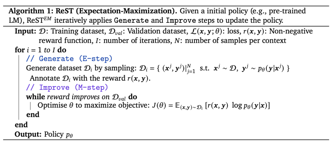 - 改进(M 步):在上一步生成的训练数据集上对原始语言模型进行监督微调。微调后的模型将用于下一个生成步骤。