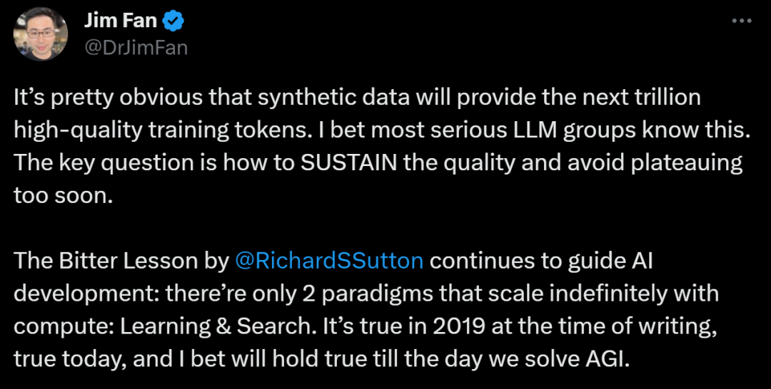不久前Jim Fan就在推特上表示,合成数据将提供下一万亿个高质量的训练token。