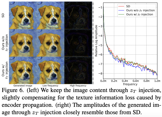 虽然编码器传播可以提高推理阶段的效率,但我们观察到它会导致生成结果中的纹理信息的轻微丢失。受相关文献启发,我们提出了一种先验噪声注入策略:它将初始潜码zT结合到后续时间步长的生成过程中,如果t < τ,则遵循zt = zt+α·zT,其中α = 0.003是控制zT影响的尺度参数。我们从τ = 25步开始使用这种注入机制。这种策略性的结合成功地改进了纹理信息。重要的是,它需要的额外计算资源几乎可以忽略不计。这种方法确保了SD和zT注入在频域中生成的结果非常相似,生成的图像保持了所需的保真度。