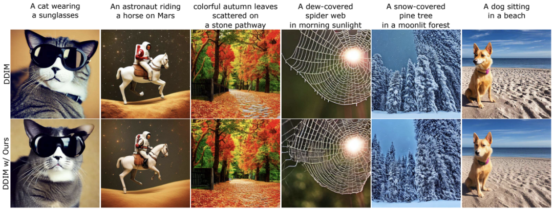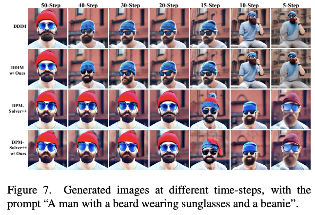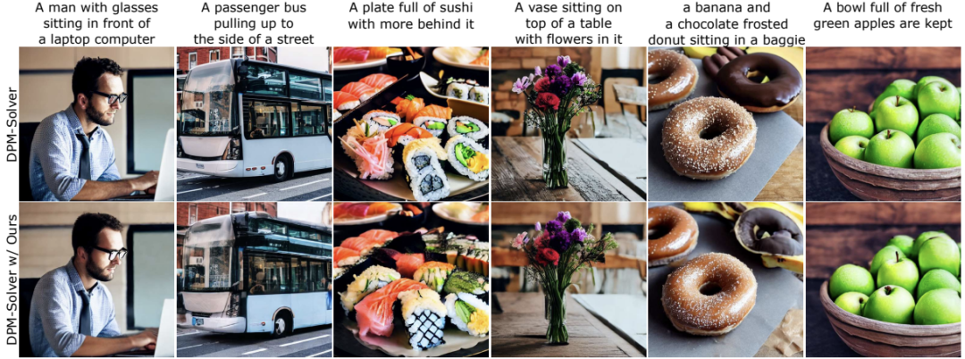 此外,我们的方法可以与最新的采样技术相结合,如DPM-Solver,DPMSolver++。我们的方法提高了采样效率,同时保持了良好的模型性能,FID和Clipscore值的变化可以忽略不计。我们的方法在不同的采样步骤中实现了良好的性能。重要的是,这些结果表明,我们的方法是正交的,并与这些加速技术兼容。