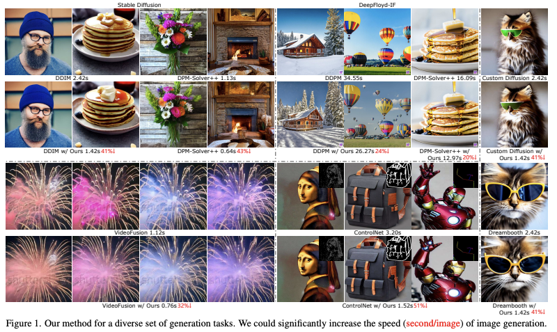 除了标准的文本到图像任务外,我们还在其他任务上验证了我们的方法:文本到视频、个性化生成和参考引导生成。在不使用任何知识提取技术的情况下,我们的方法将稳定扩散(SD)和DeepFloyd-IF模型的采样速度分别提高了41%和24%,同时保持了高质量的生成性能
