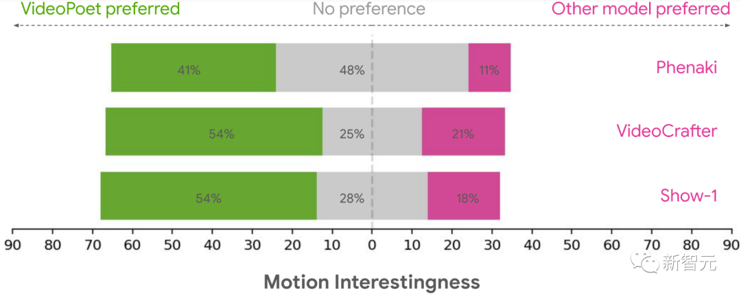 此外,41%-54%的评估者认为VideoPoet中的示例动作更有趣,而其他模型只有11%-21%。
