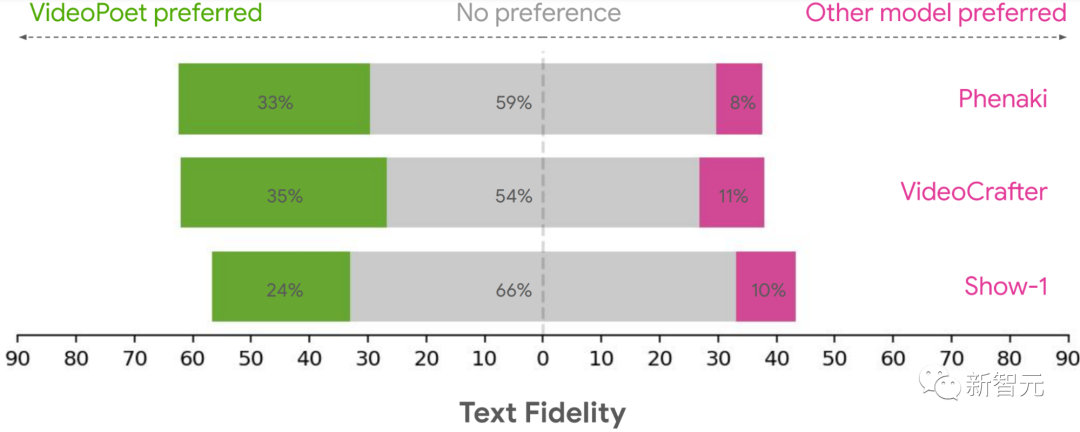 综上可见,平均有24-35%的人认为VideoPoet生成的示例比其他模型更加遵循提示,而其他模型的这一比例仅为8-11%。