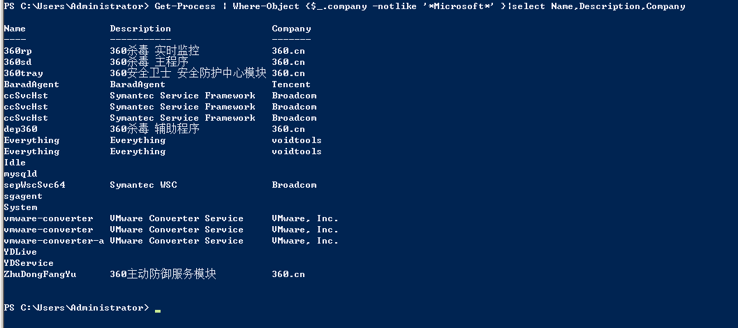 平时排查问题时,用powershell过来进程还挺高效的,比如这句命令显示没有Microsoft关键词的进程