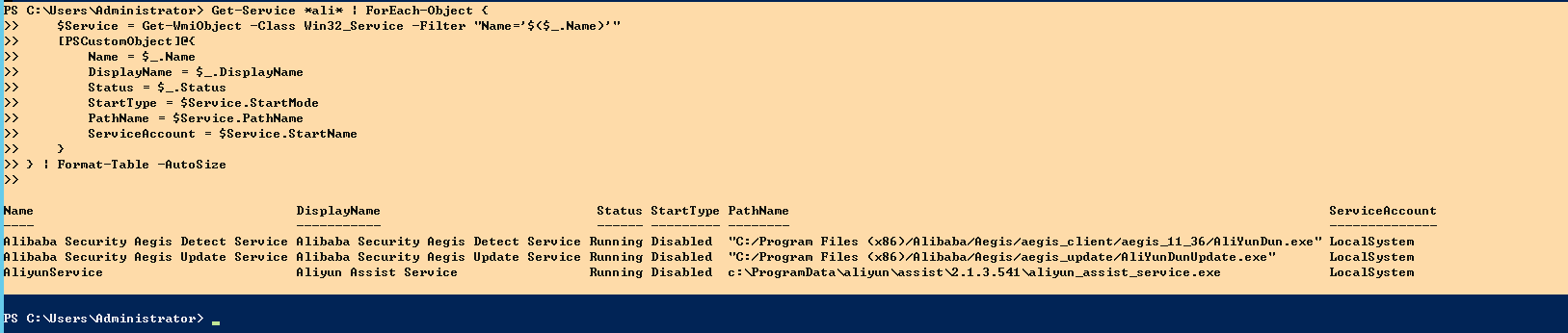 一下子就滤掉了含有Microsoft关键词的进程,剩下的就不多了,然后再指定servicename去筛选列出细节,就能比较快速排查一些服务或进程了,例如下面的这段get-service *ali* 起头的代码,显示匹配的服务名称、服务启动类型、服务路径、服务运行状态、服务运行的用户