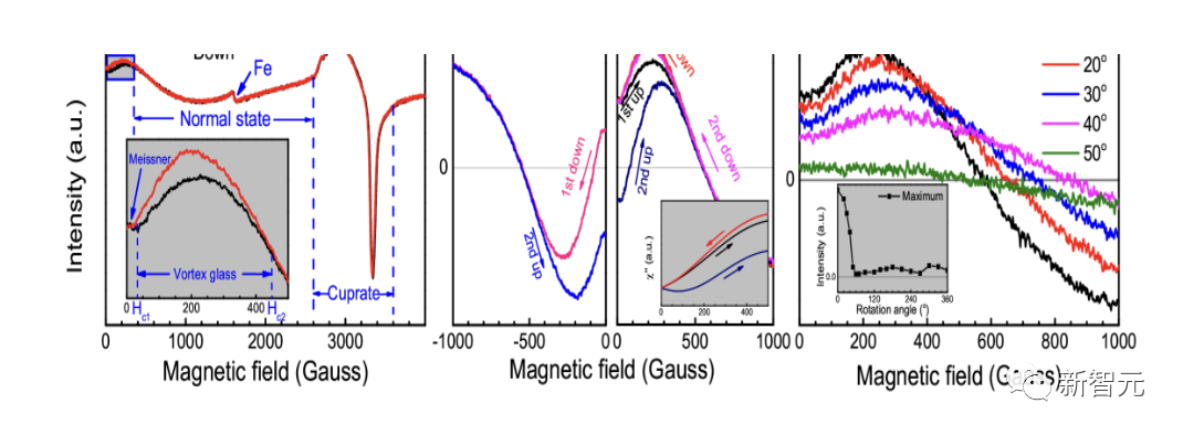 研究人员将这个区域分为三个阶段:低于30高斯的小平台(迈斯纳效应)、正信号(30 – 500 高斯,即漩涡玻璃vortex glass)和负信号(500 – 2600高斯)