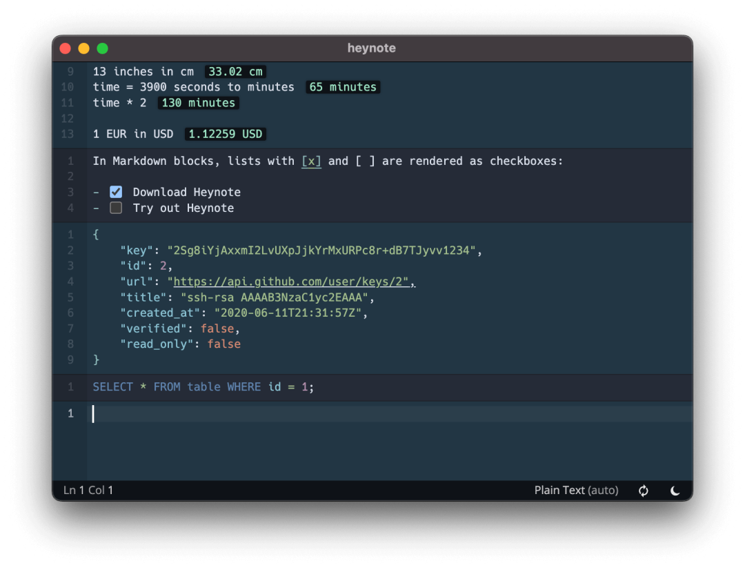 Heynote 是一款专为开发人员设计的便签工具,可以作为一个大型持久性文本缓冲区,在其中你可以记录任何内容,比如 Slack 消息、API 返回的 JSON 响应、会议笔记和每日待办事项等。 该工具将缓冲区划分成块,并且每个块都可以设置自己的语言 (例如 JavaScript、JSON、Markdown 等),从而实现语法高亮并允许自动格式化 JSON 响应。 其主要功能包括: