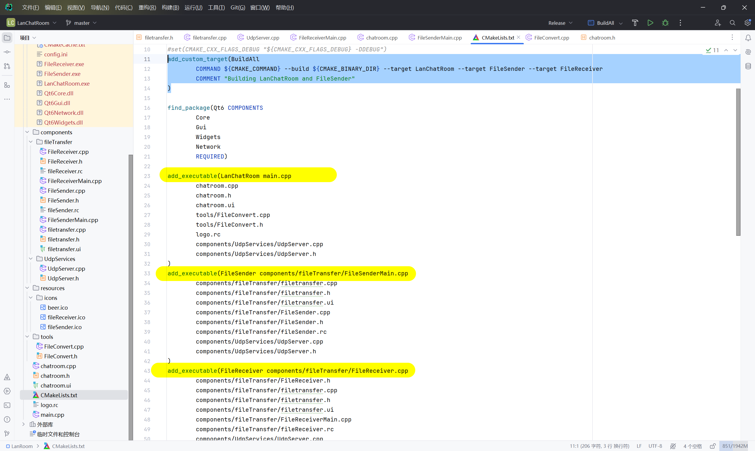 熟悉信号槽之后,就可以考虑转到clion了。 而且clion默认配置的cmakelist文件也更加清晰。