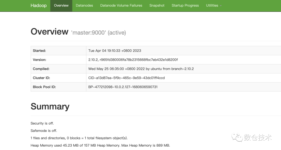 在浏览器中访问 http://master:50070 可以进入hadoop 查看。(前提在本地配置了master的外网IP映射)或者也可以直接访问http://你的master外网IP:50070 进行访问即可