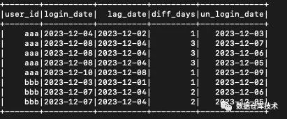 select user_id,login_date,lag(login_date,1,login_date) over(partition by user_id order by login_date) as lag_date,datediff(login_date,lag(login_date,1,login_date) over(partition by user_id order by login_date))-1 as diff_days from t_login_38