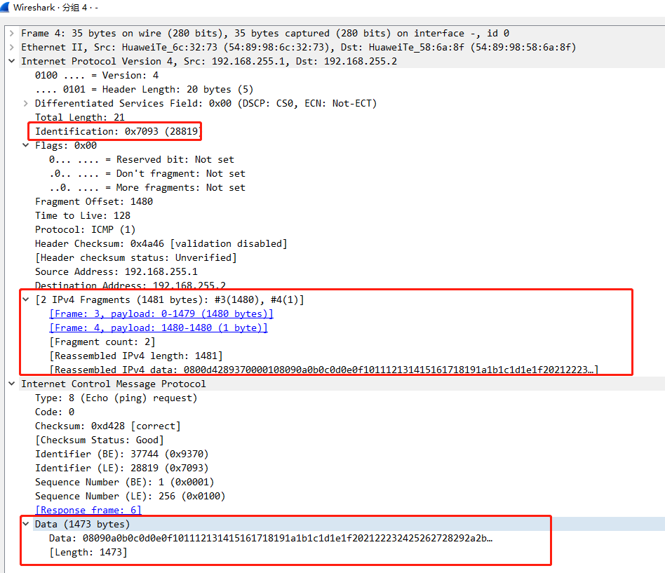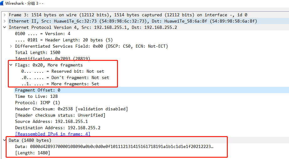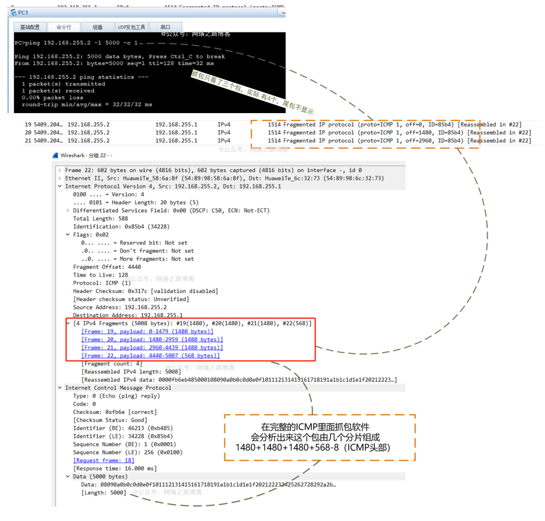 这里要注意,1473表明的是ICMP数据部分的大小,不计算头部在内,那么加上头部后呢? 1473+8(ICMP头部)+20(IP头部)=1501,这样正好超过了1500个字节,所以导致分片了。MTU是二层概念,二层以上的头部加数据不能超过1500,否则会进行分片。