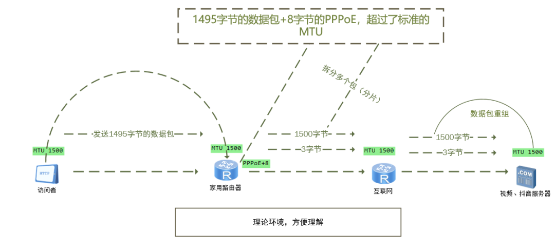 那是因为宽带拨号使用的协议是PPPoE,由于还没涉及这一块的知识点,我们在这知道它占用8个字节就行,并且是封装在以太网中的。比如访问者发送了一个1495字节的数据包给视频服务器,但是由于家用路由器采用的是这就在原来1500的字节上多出来了8个字节,超过了标准的MTU值1500字节,所以这个时候家用路由器会将这个数据包进行分片,分为2个,一个为数据包为1500个字节,另外一个数据包为3个字节,到了服务器这边在进行重组。(实际会更加复杂点,待会我们来做个小实验)