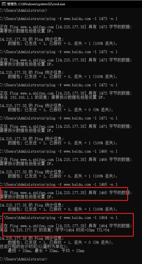 ping命令里面带有一个参数-f 它可以把IP包的DF位置1,让其不分片,那么超过MTU需要分片的设备发现DF位置一,则直接丢弃,返回一个ICMP的差错报文结果,通过这样来测试出一个合适的MTU值。