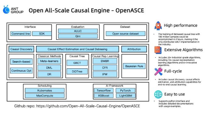 大会第一天,蚂蚁集团在主题为“知识增强 AI 在垂直行业的应用探索”的研讨会上正式开源了业界首个分布式全链路因果学习系统 OpenASCE (Open All-Scale Causal Engine) 。