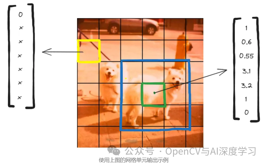 另外,如果我们看一下黄色网格单元,我们知道它不包含任何对象,因此我们可以简单地将置信值 0 分配给其输出向量。“x”表示无关项,这意味着我们可以安全地忽略输出向量中的所有其他值。