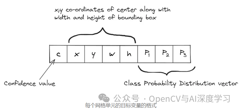 第一个单元格指的是置信度值,它只是一个标签,决定是否有任何对象位于网格单元格内(0 或 1)。如果答案是肯定的,那么我们继续以 xywh 格式预测边界框的值,其中 x 和 y 是边界框中心的坐标,w 和 h 指边界的宽度和高度盒子。最后,我们有类概率分布向量,其中包含每个对象标签的预测分数,范围在 0到1之间。