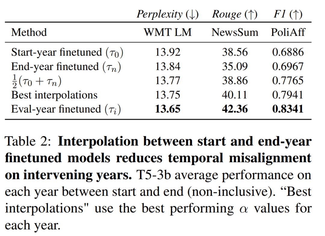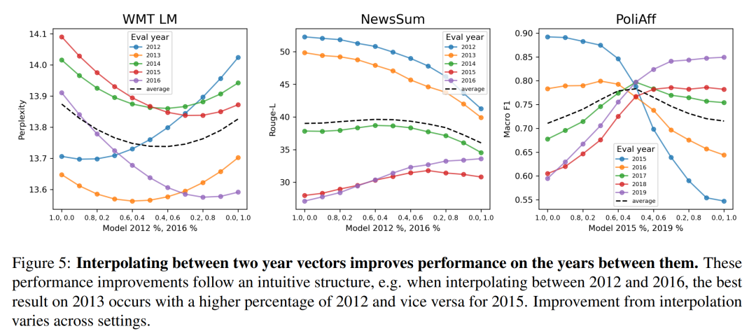 如图 5 所示,在 WMT LM 和 PoliAff 任务中,在起始年和结束年微调模型之间进行内插可以提高中间年份的性能。一般来说,中间年份(WMT LM 为 2014 年,PoliAff 为 2017 年)的改进幅度最大,而在更接近起始和结束时间的年份,改进幅度则会减小。不同设置下的改进模式也不尽相同,与 WMT LM 相比,PoliAff 在 α = 1.0 和 0.0 附近的性能变化更为平缓,而 NewsSum 在不同 α 之间的改进与验证年份之间的性能差异相比微乎其微。表 2 量化了这些变化,显示插值法缩小了时间对齐模型和错位模型之间的差距。PoliAff 的改进尤为显著,仅平均值就提高了近 8 个 macro-F1 百分点。