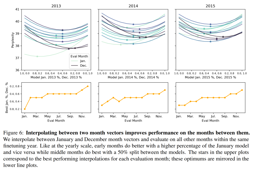 图 6 显示,这些结果扩展到按月划分的 WMT LM 后;可以在一年内 1 月和 12 月确定的时间向量之间进行插值,以提高这几个月的模型表现。每个月的最佳插值遵循一个直观的模式,1 月份模型的百分比越高,会导致前几个月的性能更好,反之亦然。
