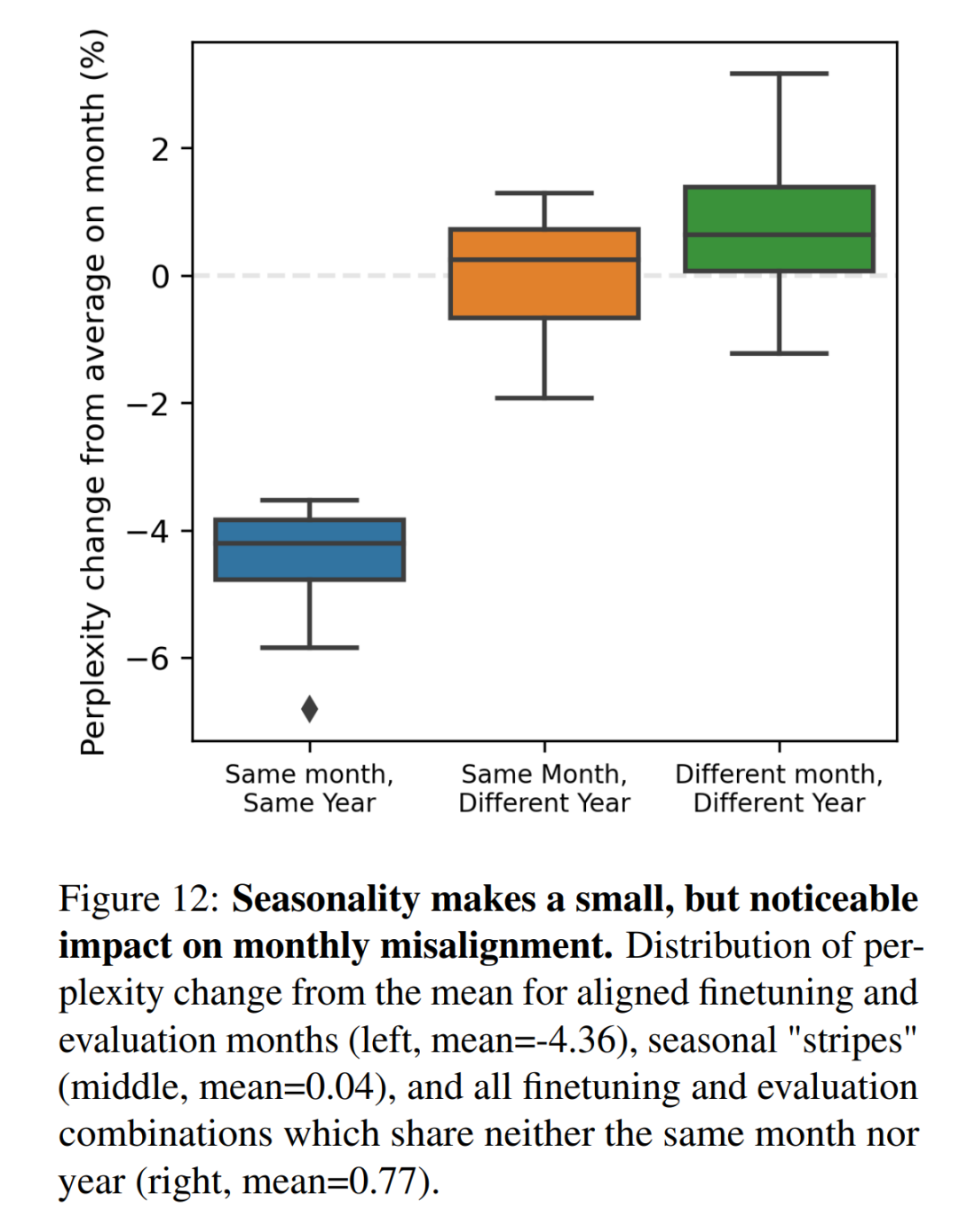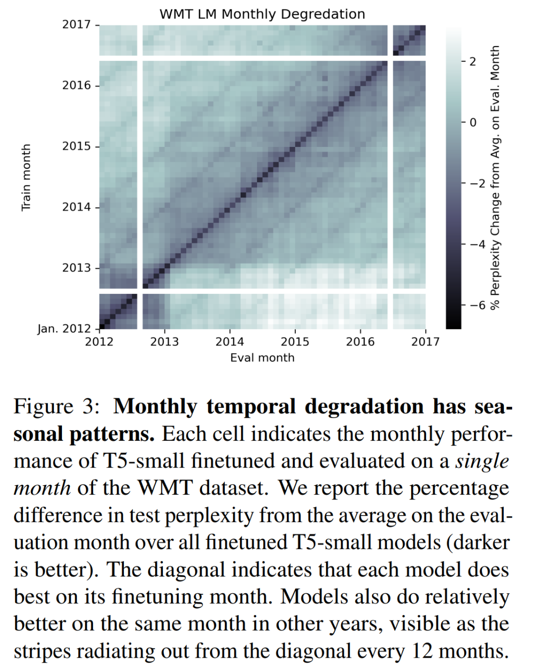 如图 3 所示,在 WMT 数据集的特定月份上对模型进行微调和评估,可以发现时间错位的非线性模式,与每年的月份周期相对应。每隔 12 个月出现的平行于对角线的条纹可以捕捉到这种模式,这表明特定月份的模型在其他年份的相同月份往往表现更好。本文在附录图 12 中量化了这些困惑度差异。还在 §A.4 中总结了线上训练设置中的模型退化模式。