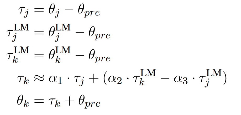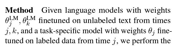 是根据 j、k 时间段的未标注文本微调的,而任务特定模型的权重 θ_j 是根据 j 时间段的标注数据微调的,对向量进行如下运算: