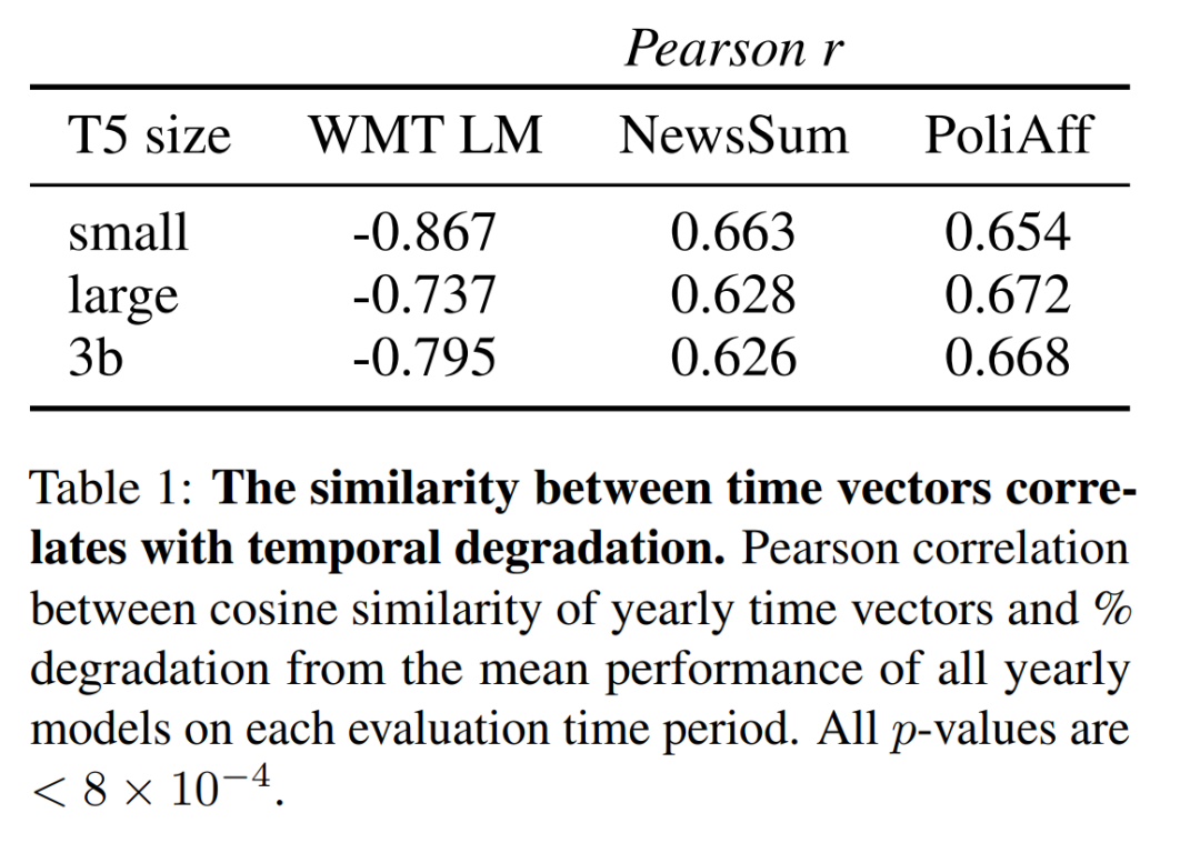 表 1 显示,余弦相似度与不同年份相对性能变化之间的相关性在 WMT 语言建模中最高。同时,这种相关性在不同规模的 T5 中也基本相似,在 WMT LM 中,T5-small 的得分高于 T5-large 和 T5-3b,且绝对值均不低于 0.6。
