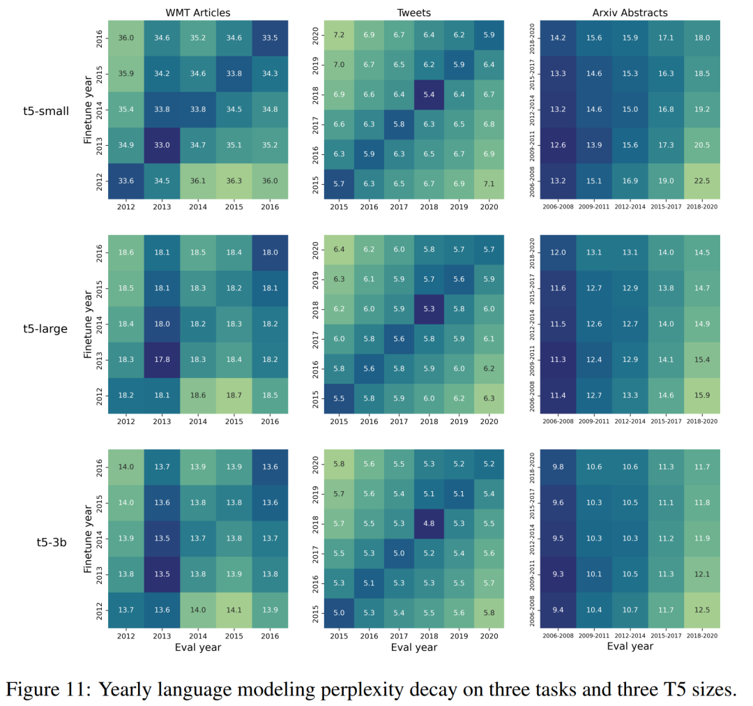为了证实这些结果,本文在每个数据集的每个年度分段上对 T5-small、T5-large 和 T5-3b 进行了微调。然后,在测试数据的每个其他时间分段上对这些经过调整的模型进行评估。