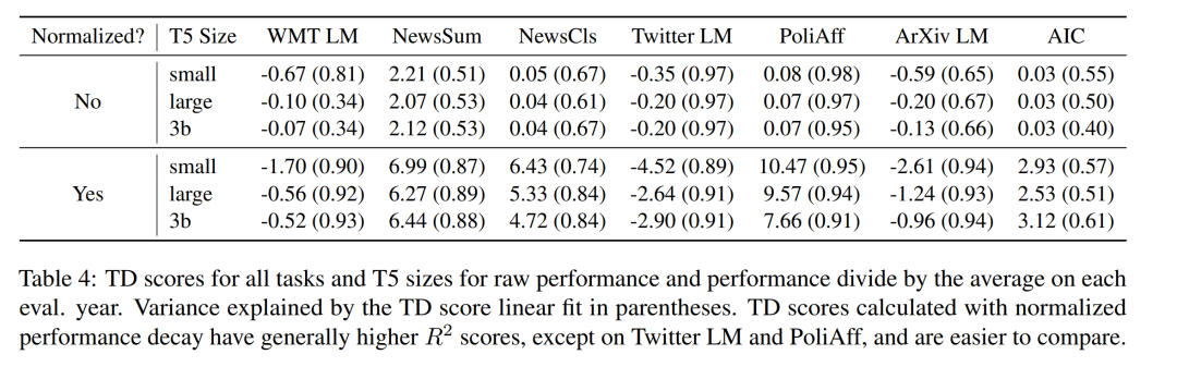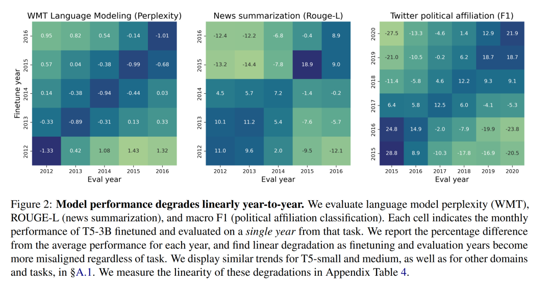 图 2 中以年为单位展示了时间错位热图,以及与年平均值相比的困惑度变化百分比(避免固有的年度性能差异)。与之前的研究结果一致,本文观察到每个任务中都存在着线性退化的特点,无论模型的大小(更多详情请参见表 4)。与 早先研究结果一样,有些任务(如政治派别分类)的退化比其他任务更明显。原文附录中的 §A.2 中会对这些差异进行量化。