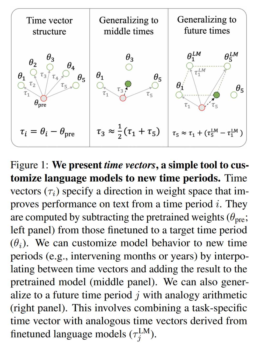在第 4 章中,本文引入了时间向量,作为任务向量的扩展(参见论文「Editing Models with Task Arithmetic」)。即在单个时间段的文本上对预训练的语言模型进行微调后,减去原预训练模型的权重,得到一个新向量。这个向量代表了权重空间的移动方向,可以提高模型在处理目标时间段文本时的性能。