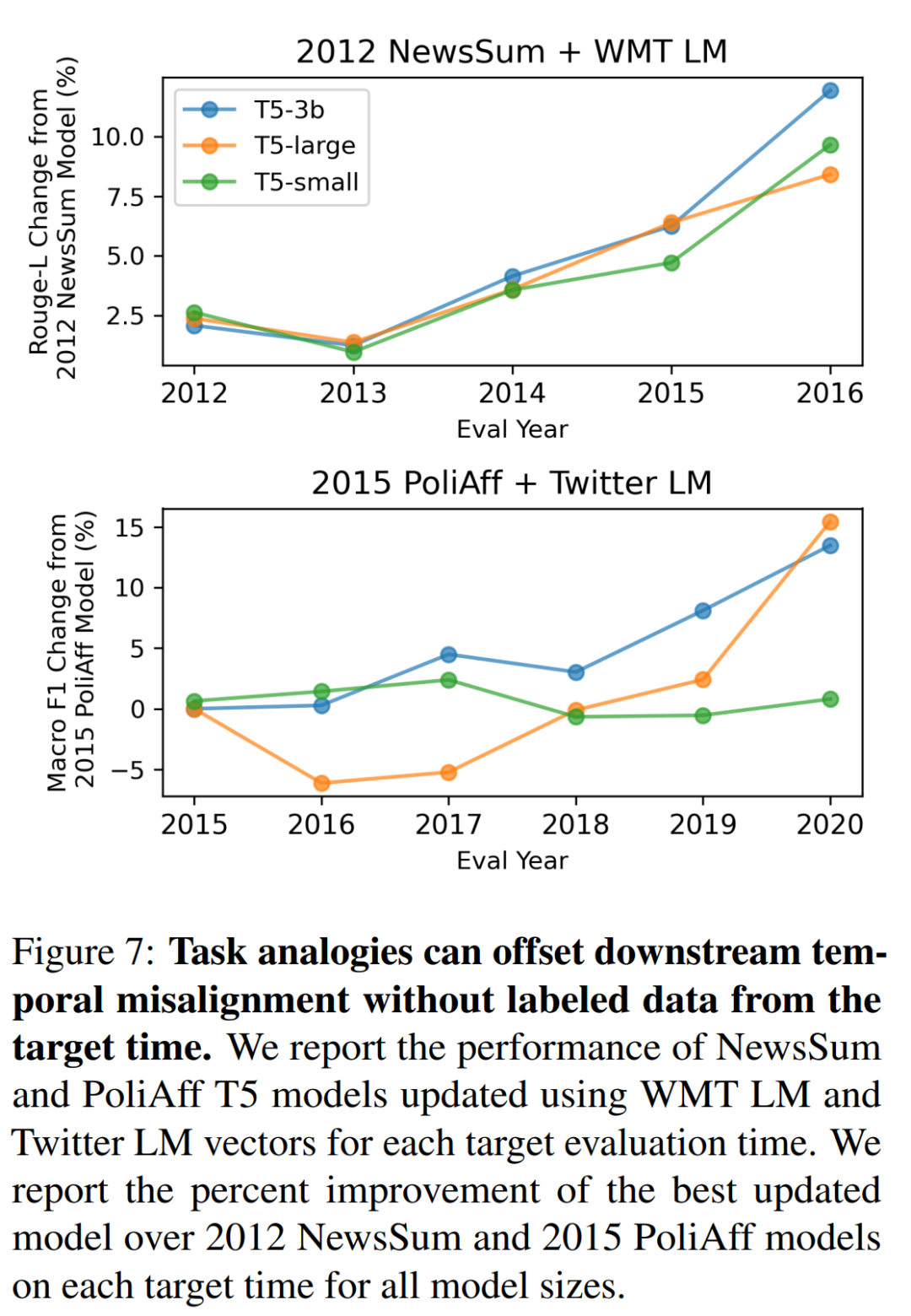 任务类比算法提高了 PoliAff 和 NewsSum 任务在未来年份的性能。图 7 显示,随着目标年份和起始年份的错位越来越大,与起始年份的微调相比,改进幅度也越来越大。模型大小也会影响性能,T5-large 和 T5-3b 的改进幅度更大。在 PoliAff 中,T5- small 与基线相比没有改善,而 T5-large 任务类比在 2016 和 2017 年的表现比基线差,在 2019 和 2020 年才有所改善。奇怪的是,作者发现只是缩放 α_1 也能提高模型完成未来几年任务的性能。附录 A.6 中报告了 α 消减和其他两个分类任务的结果。在这些任务中,研究者观察到的结果大多相似,但也有因任务而异的不一致之处。