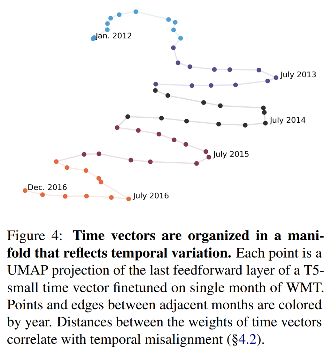 在第 2 章中,本文利用按时间组织的数据集分析时间向量的结构,用于语言建模、分类和总结。研究结果一致表明,时间向量直观地分布在一个流形上;在时间上更接近的年份或月份产生的时间向量在权重空间上也更接近。同样,在 4.2 节中,本文还表明,年度和月度中的时间退化问题与时间向量之间的角度密切相关。