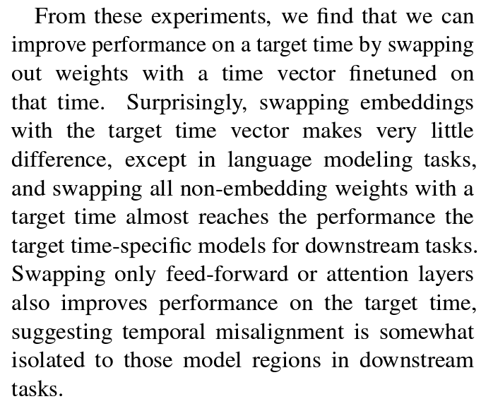 本文利用这种时间向量结构来引导模型,使其更好地覆盖新的时间段的数据。通过在两个时间向量之间进行插值,可以产生新的向量,这些向量应用到预训练模型时,可以提高模型在间隔月份或年份中的性能(第 4.3 节)。该结构还可用于跨时间段泛化特定任务模型,并使用专门用于未标记数据的类似时间向量(第 4.4 节)。